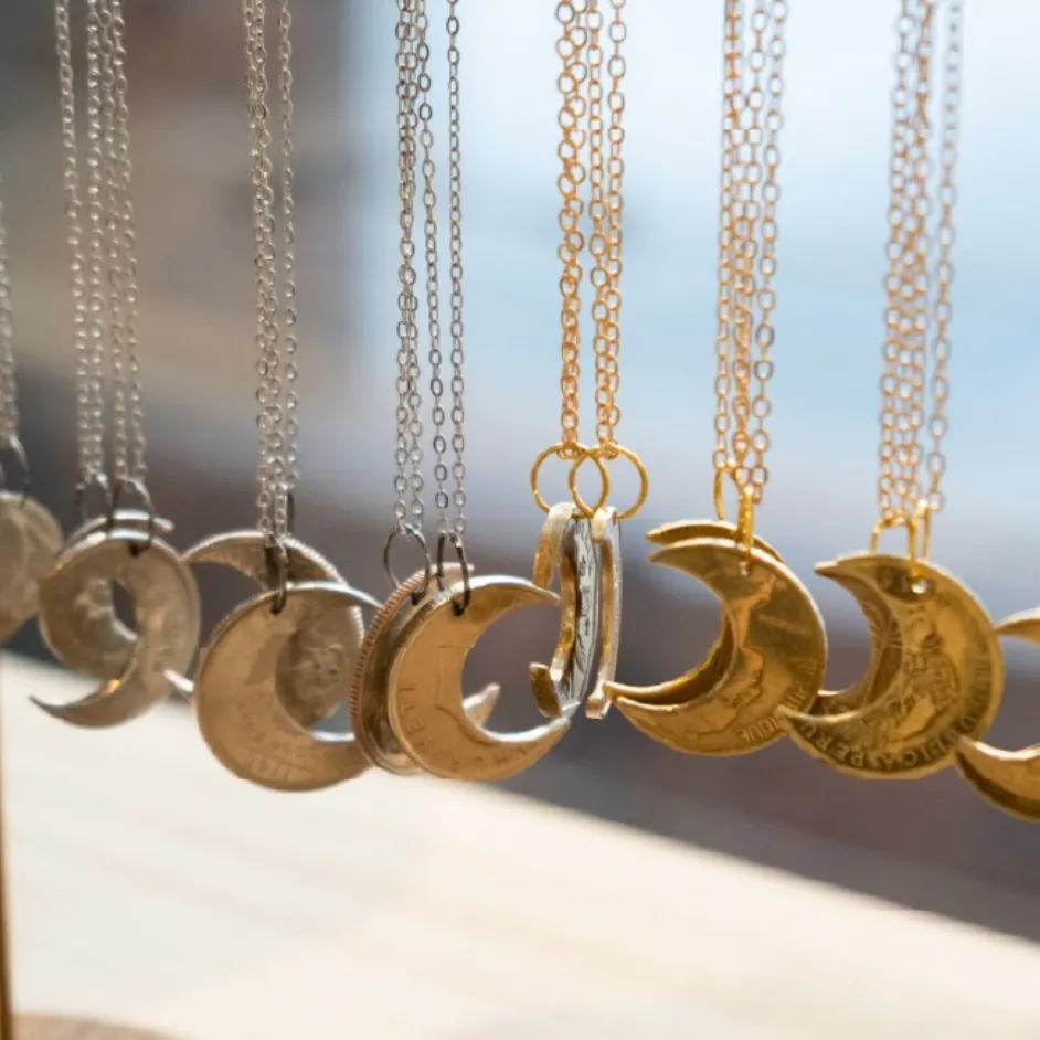 コインからできた三日月ネックレスも販売しているので、リングと合わせてお気に入りを見つけてみては?